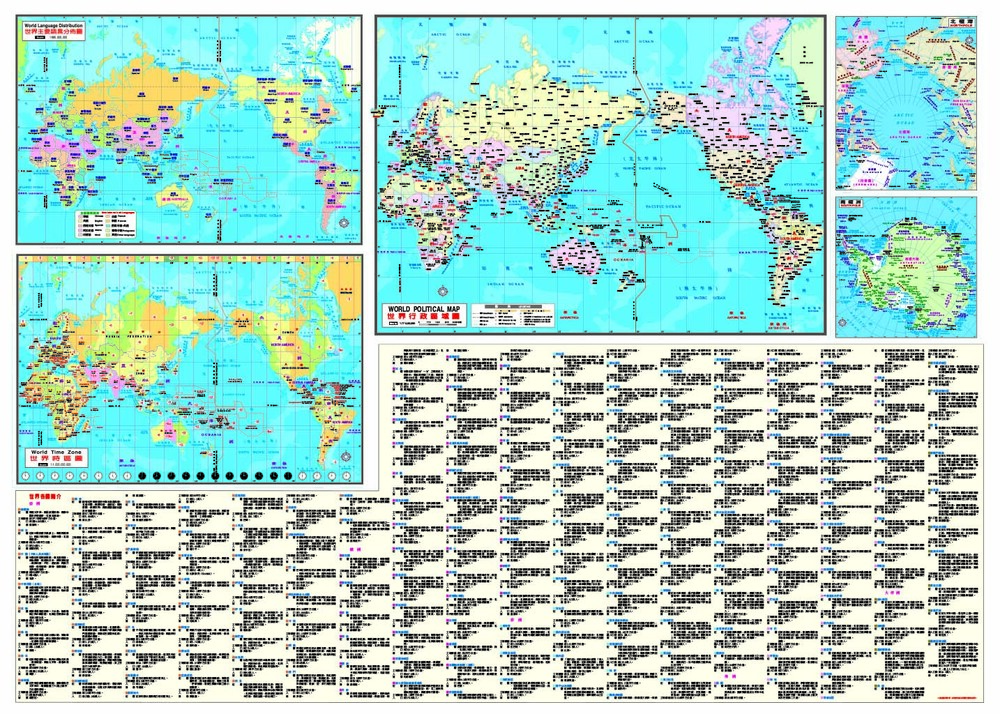 內附:世界行政區域圖、世界時區圖、世界主要語言分佈圖、北極海及南極洲地圖